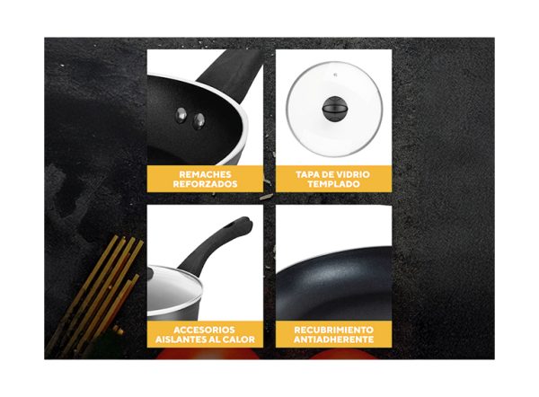 - Recubrimiento antiadherente tipo grafito, que facilita la cocción saludable y permite limpiar cada pieza en cuestión de segundos.